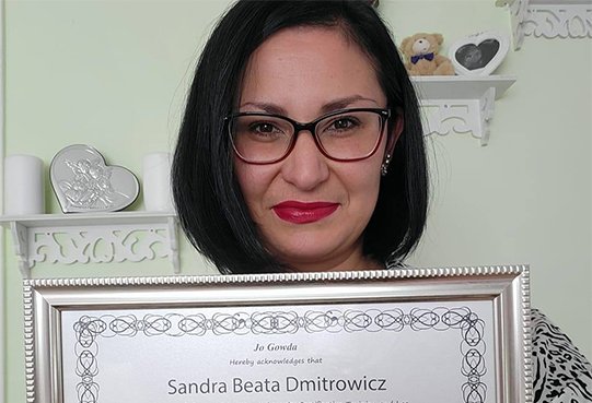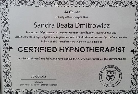 Jestem Sandra Dmitrowicz, certyfikowana hipnoterapeutka z pasją do pomagania ludziom w odkrywaniu siły wewnętrznej transformacji.